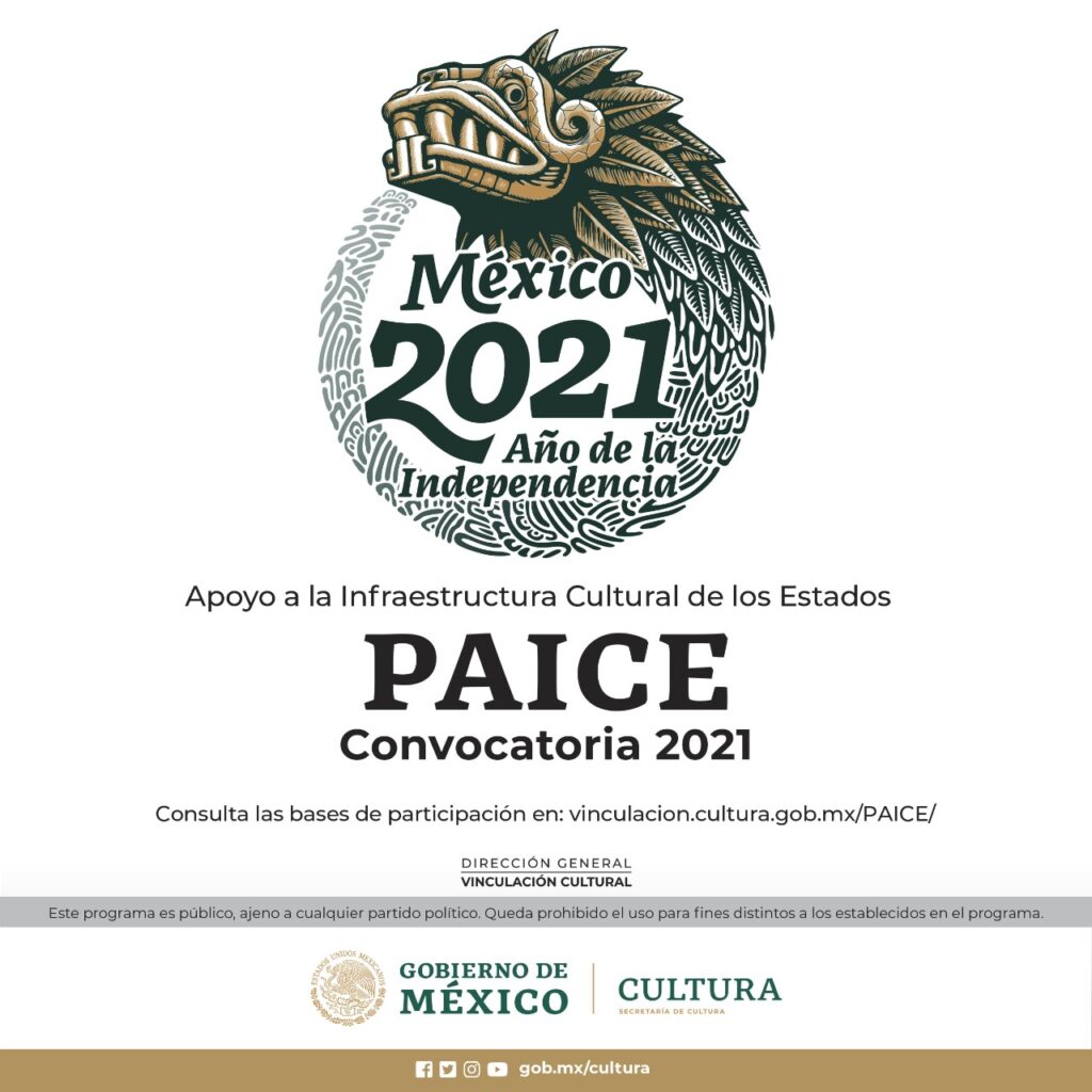 La Secretaría de Cultura del Gobierno de México, a través de la Dirección General de Vinculación Cultural (DGVC), lanza la convocatoria de Apoyo a la Infraestructura Cultural de los Estados (PAICE) 2021, con el objetivo de crear o aprovechar espacios dedicados al arte y la cultura a lo largo y ancho del país y así disminuir la desigualdad social en materia de desarrollo cultural.