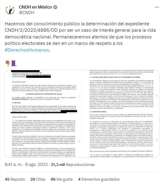La CNDH respondió a la queja interpuesta por el Partido Acción Nacional (PAN) contra los señalamientos del presidente López Obrador sobre Xóchitl Gálvez, Santiago Creel y Francisco García Cabeza de Vaca.
