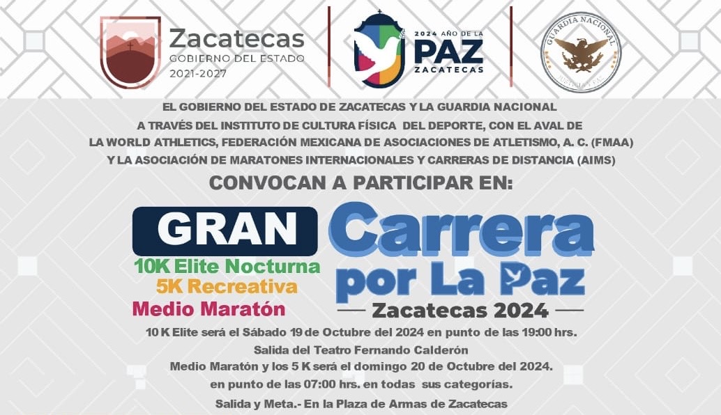 Zacatecas, Zac.- El Gobernador David Monreal Ávila y la Guardia Nacional convocaron a participar en la Gran Carrera por la Paz Zacatecas 2024, en las categorías 10K élite nocturna, 5k recreativa y medio maratón, todas en las ramas femenil y varonil.
