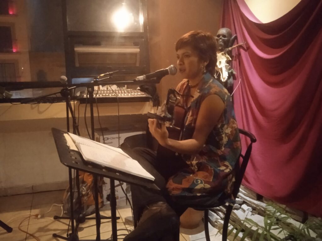 Interpretó canciones propias y algunos cover que hicieron cantar a los presentes.