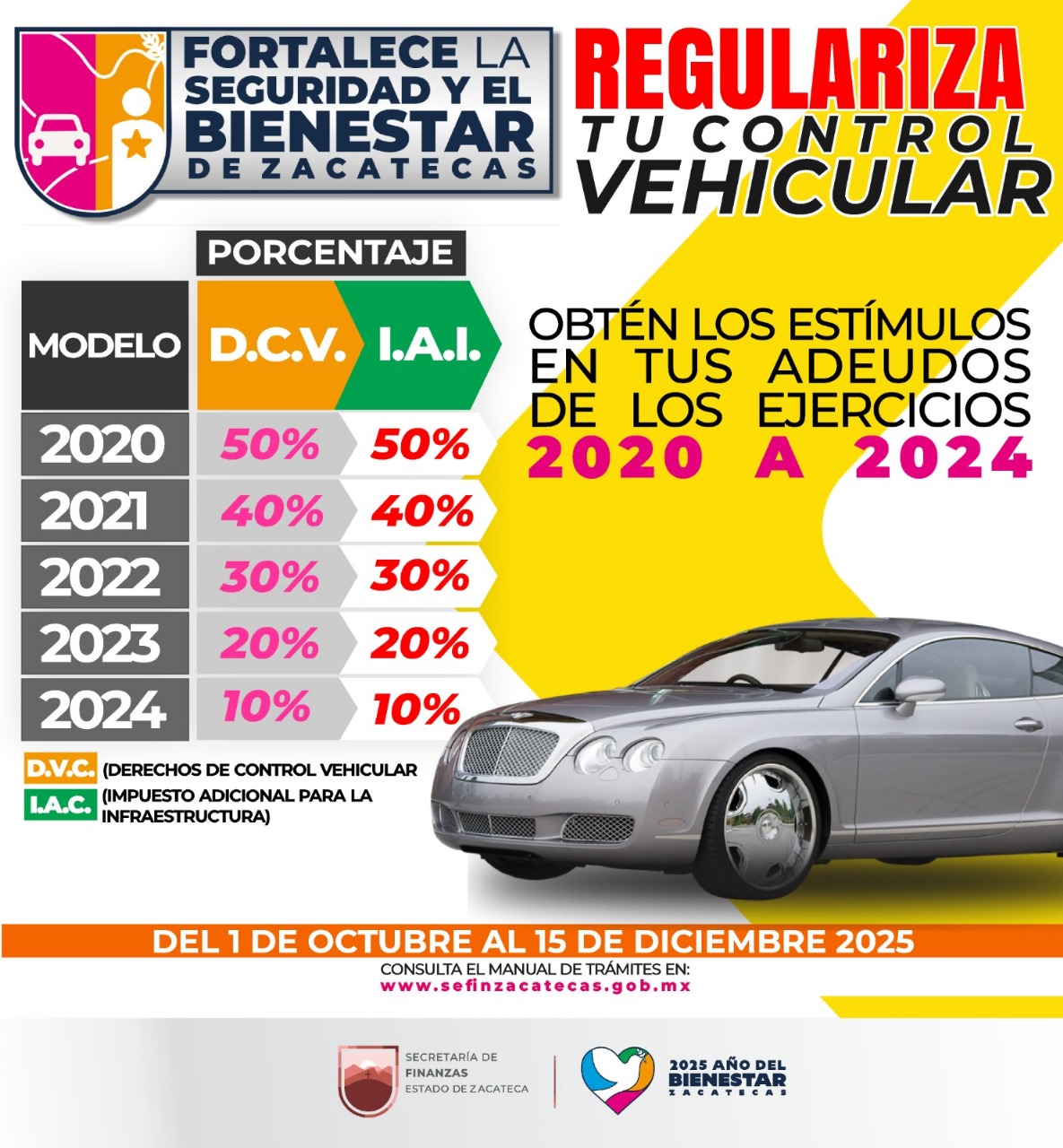 Zacatecas, Zac.- El Gobierno de Zacatecas, encabezado por el mandatario estatal David Monreal Ávila, informa a la ciudadanía que el próximo 15 de diciembre concluye el periodo para acceder a los estímulos fiscales del Programa de Regularización Vehicular para la Seguridad y el Bienestar, implementado a través de la Secretaría de Finanzas, que encabeza Ruth Angélica Contreras Rodríguez.