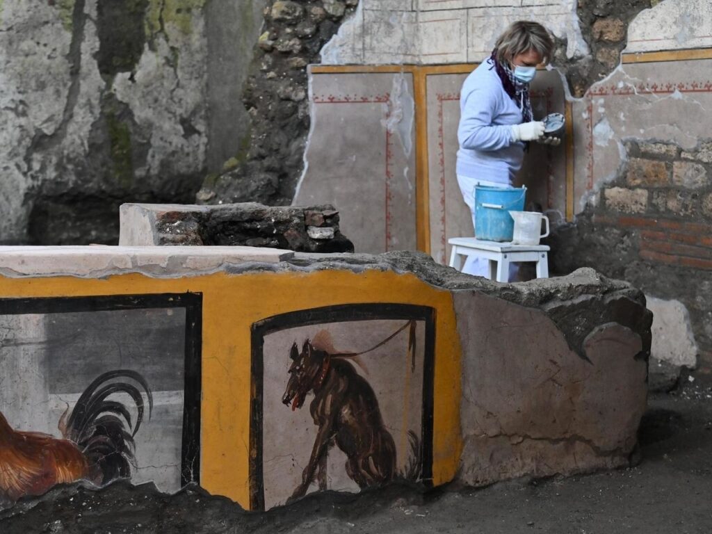 En diciembre, los arqueólogos anunciaron un descubrimiento excepcional: un “thermopolium”, una especie de puesto callejero de comida rápida en la antigua Roma, decorado con estampas policromáticas y en un estado de conservación excepcional.