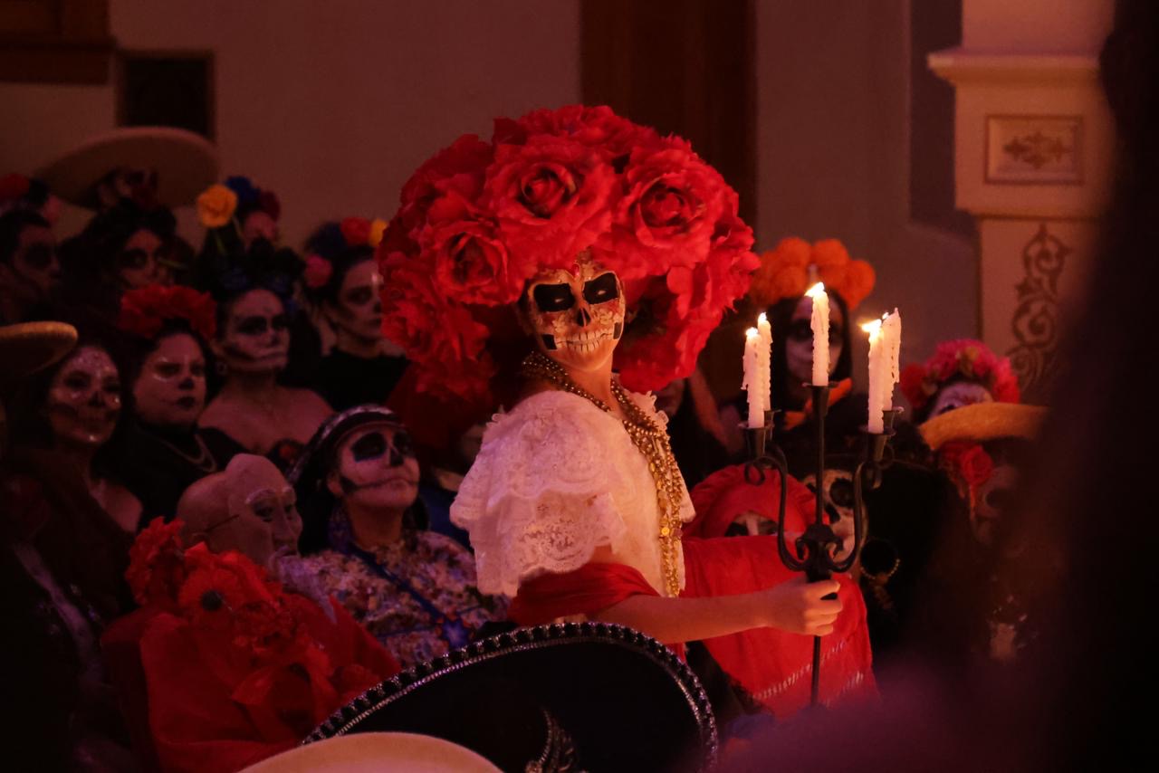 El evento se convirtió en una auténtica fiesta visual, con maquillajes espectaculares, trajes llenos de brillo, plumas, bordados, flores de cempasúchil, máscaras tradicionales y música viva, que retumbaba en cada rincón del histórico recinto. Las y los asistentes, entre luces, cámaras y acción, se convirtieron en embajadores del espíritu del Día de Muertos.