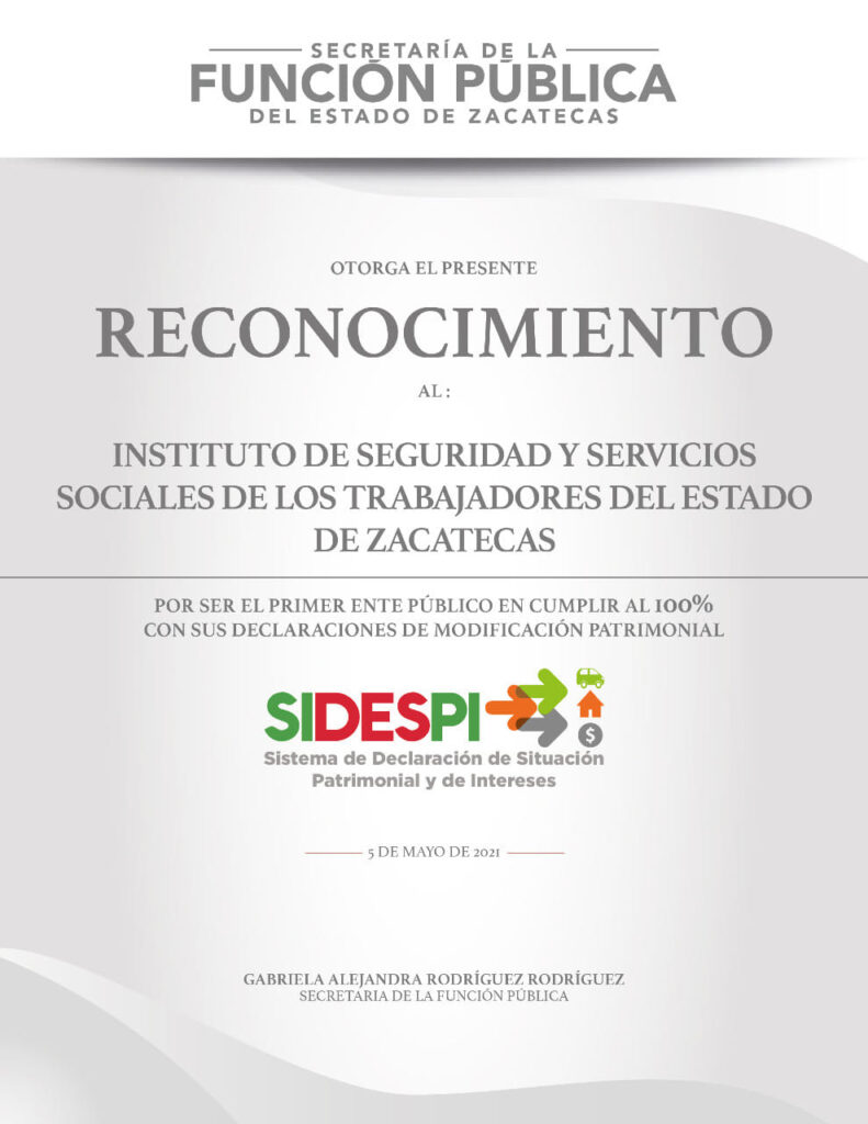 El Instituto de Seguridad y Servicios Sociales de los Trabajadores del Estado de Zacatecas (Issstezac) es el primer ente de la administración pública estatal en cumplir al 100 por ciento con la Declaración de Modificación Patrimonial del ejercicio 2020, gracias al compromiso y responsabilidad de la totalidad de las y los servidores públicos adscritos a esta dependencia.