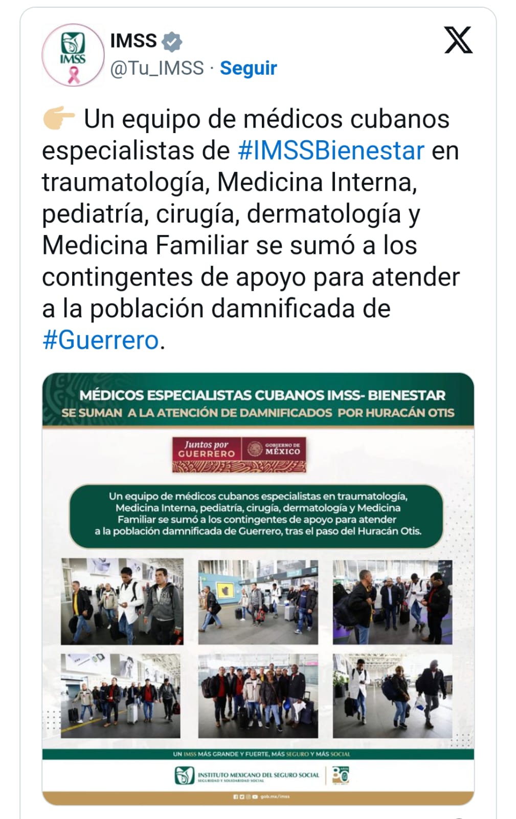 Andrés Manuel López Obrador, informó este martes que al menos 35 médicos cubanos están en Acapulco para apoyar a los afectados tras el histórico azote del huracán Otis, que ha dejado 46 muertos tras impactar la semana pasada a Guerrero.