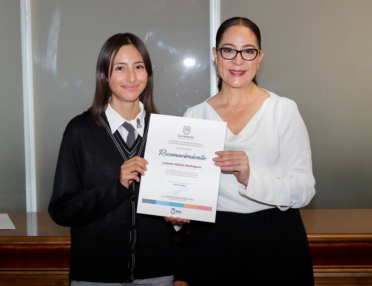 Zacatecas, Zac.- El talento y la creatividad de la alumna Lizbeth Molina Rodríguez, ganadora del concurso “Yo no. Letras contra la discriminación”, que organiza la SEP, fueron reconocidos por la Secretaría de Educación del estado, cuya titular aseguró que la sociedad necesita personas como esta joven para inspirar a otros a salir adelante y lograr sus sueños.
