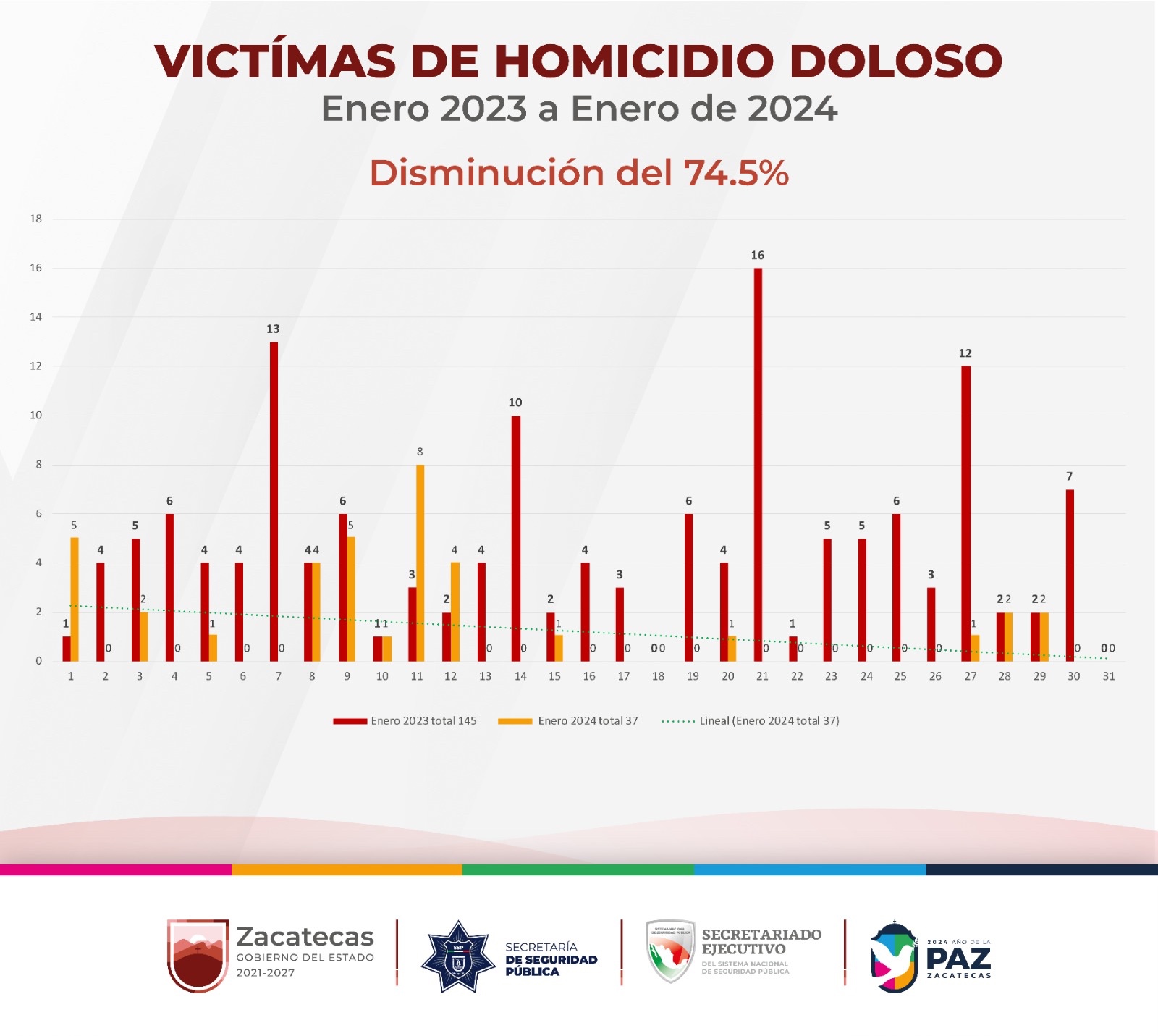 De acuerdo con el reporte diario del Secretariado Ejecutivo del Sistema Estatal de Seguridad Pública (SESESP), Zacatecas cerró el mes de enero con 37 homicidios, por lo que, al compararlo con el mismo periodo del 2023, cuando se presentaron 145 eventos de esta naturaleza, se obtuvo una reducción superior al 70 por ciento.