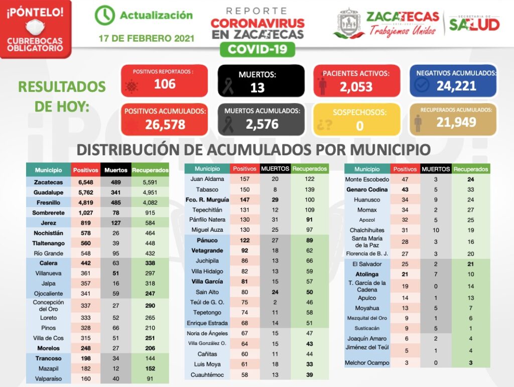Un total de13 personas de ocho municipios murieron por COVID-19, con lo que Zacatecas llega a un total de 2 mil 576 defunciones, desde el inicio de la pandemia, informó Gilberto Breña Cantú, secretario de Salud.