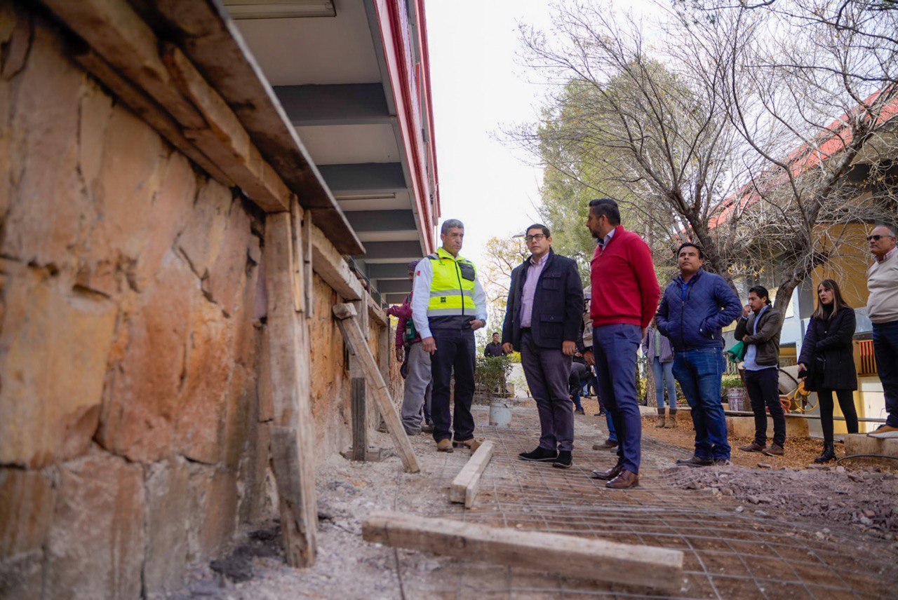 El alcalde capitalino, Jorge Miranda Castro, realizó un recorrido de supervisión en los trabajos de reposición de piso de concreto que se llevan a cabo en el CBTis 23, beneficiando a decenas de estudiantes y personal administrativo.