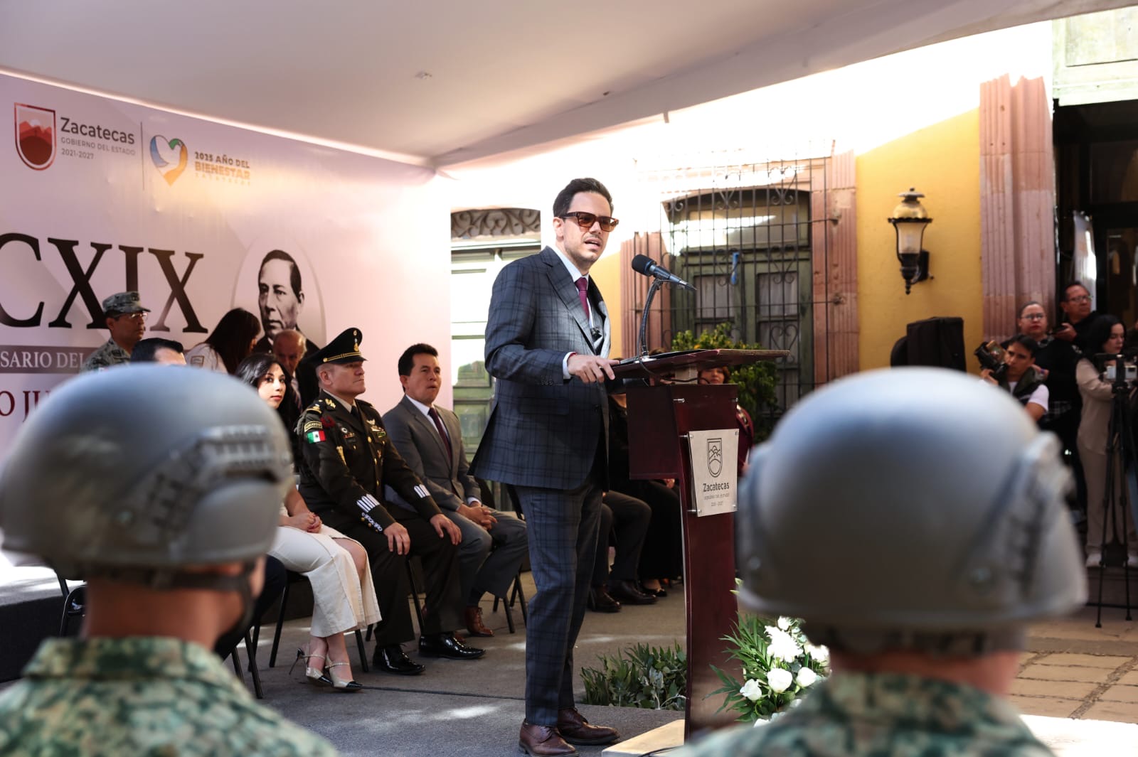 Zacatecas, Zac.- Durante la ceremonia cívica por el 219 aniversario del Natalicio del Benemérito de las Américas, Benito Juárez García, en representación del Gobernador David Monreal Ávila, el Secretario General de Gobierno, Rodrigo Reyes Mugüerza, destacó que, desde el inicio de la actual administración, Zacatecas vive una transformación profunda en los 58 municipios para avanzar a la pacificación y el bienestar social.
